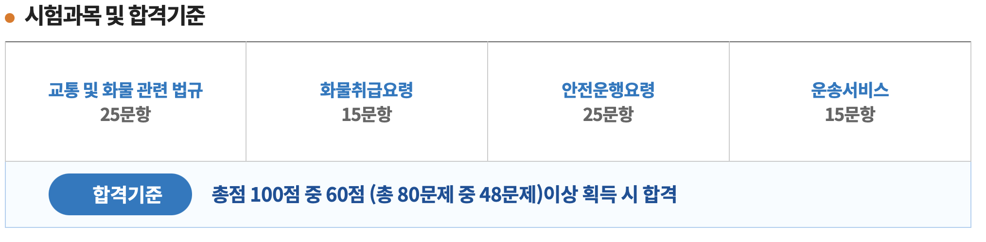 화물운송 자격증 시험은 100점 만점의 60점 이상이면 합격할 수 있습니다. 총 80문제 중 48문제 이상을 맞추신다면 합격하실 수 있습니다. 시험시간은 80분으로 80분 안에 80문제를 풀어야하기 때문에 1푼에 한 문제씩 풀어야 모든 문제를 풀 수 있습니다.